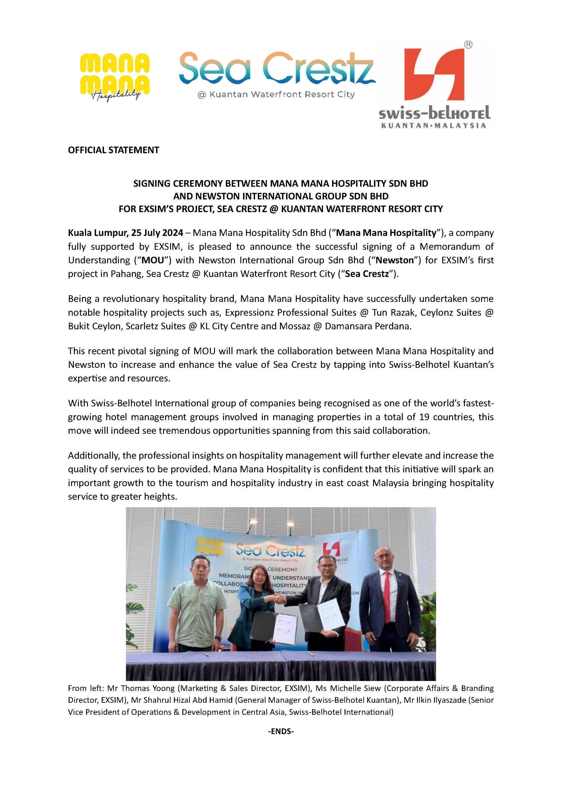 Official Statement – SIGNING CEREMONY BETWEEN MANA MANA HOSPITALITY SDN BHD AND NEWSTON INTERNATIONAL GROUP SDN BHD FOR EXSIM’S PROJECT, SEA CRESTZ @ KUANTAN WATERFRONT RESORT CITY